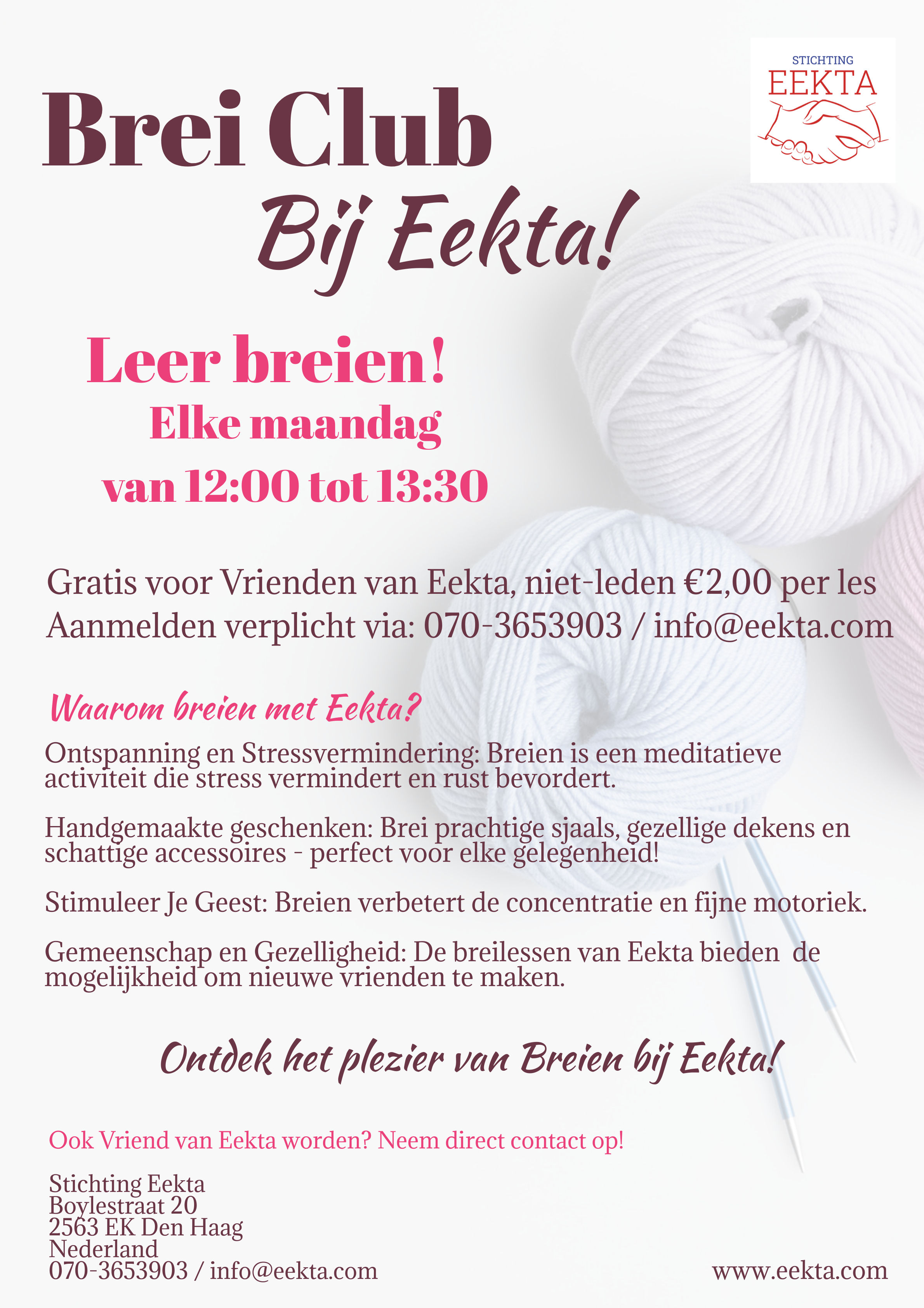 Stichting Eekta zoekt een enthousiaste en geduldige breilesdocent om breilessen te geven aan senioren.